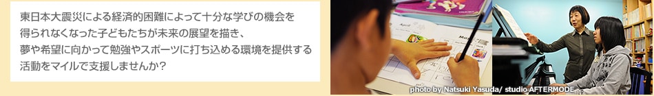 東日本大震災は、家庭の経済状況に深刻な影響を及ぼし、その結果、被災地では多くの子どもたちが、将来の夢のために学ぶ機会を得られなくなりました。それは、子どもたちが夢を諦め、将来への希望を失うことにも繋がりかねません。公益社団法人チャンス・フォー・チルドレンは、震災によって経済的困難を抱えた子どもに、塾や習い事などで利用できる「教育クーポン」を給付することで、子どもたちが未来の展望を描き、夢に向かって学ぶ環境を提供しています。