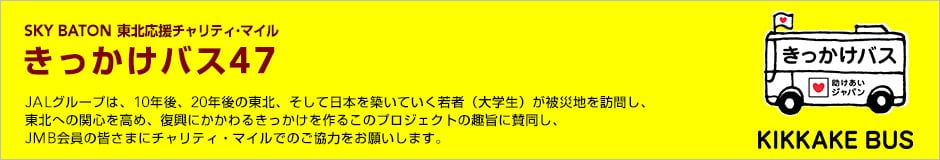「SKY BATON」の第一弾として、被災地支援活動で実績のある公益社団法人「助けあいジャパン」の主催する「きっかけバス47」の活動を支援します。JALグループとしてこのプロジェクトを航空輸送面でサポートするとともに、JMB会員の皆さまにチャリティ・マイルでのサポートへのご協力をお願いします。