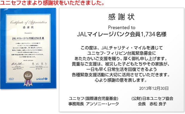 ご協力いただいたマイル相当額を「日本ユニセフ協会」に寄付いたします。