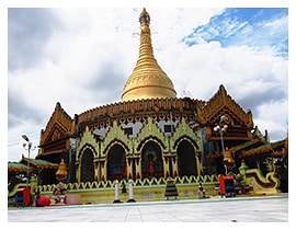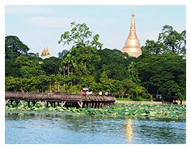 朝のカンドーヂ湖 湖畔の周遊木道を優雅に散歩する市民がすがすがしい シュエダゴン・パヤーが黄金に輝きます