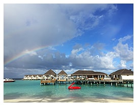 今現在タイに駐在中の我が家ですが、夏の思い出にとモルディブに行ってきました。今回は直行便で便利なバンコクエアウェイズのお世話になりました。タイ料理の機内食も、おなじみのタイビールもとてもおいしく、また出発前にラウンジも使えて感激です。モルディブは雨季でしたが、とにかく青い空と見たことのない色の海にとにかく感動。雨の降る一面もありましたが、すぐにまた晴れて写真のように虹を見ることができました。美しい自然のコラボレーションに感激し、思わず写真に収めた一枚です。また、リゾートを取り囲む海には水族館でしか見たことのない魚がたくさん。これには子供はもちろん、大人も大興奮。餌付けの時間にはエイやサメの赤ちゃんまで集まって、またそこに鳥も来るという楽しい空間ができていました。モルディブのすべてに家族みんなではしゃぎ、癒され、心に残るすばらしい旅行となりました。