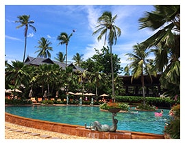 サムイ島に行って驚いたことは西洋人が多いことです。アジアンリゾートはアジア系が多くなっている印象がありましたが、サムイ島はまだまだ西洋人が多いようです。家族でゆっくりバカンスを満喫されていました。私たちはアナンタラリゾートのボプットに宿泊しました。プールもビーチもあり、どちらも楽しめます。おすすめはプールの中にあるバー。バーカウンター越しにバーテンダーがいてオーダーすることができます。なんとプールの中に椅子があり、プールにつかりながらバーにいるという変わった体験ができます。往復ともバンコクエアウェイズのフライト。機内食はタイらしい味つけで、タイを感じることができます。サムイ空港の出発ゲートは狭いが、ドリンクやパンを提供しているカウンターがあり、エコノミークラス利用でも十分に満足できます。個人的にはミロやネスレのレモンティーがおすすめです。