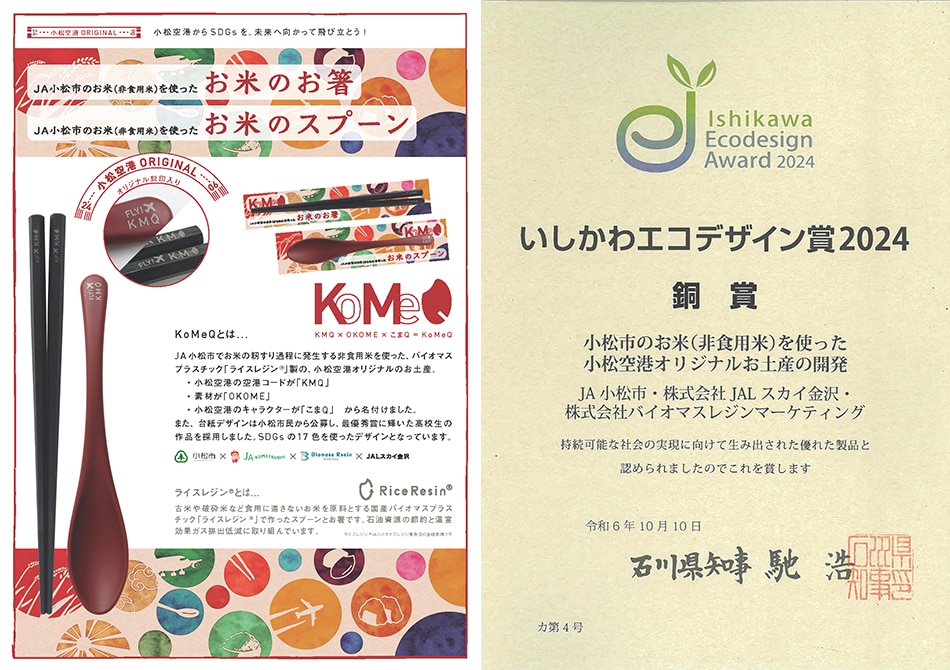 小松市のお米の籾すり過程で発生する非食用米を使ったバイオマスプラスチック「ライスレジン」製で小松市のお米を使用した空港オリジナルデザインのお米の国産バイオマススプーン・箸の販売は、全国で初めての取り組みです。