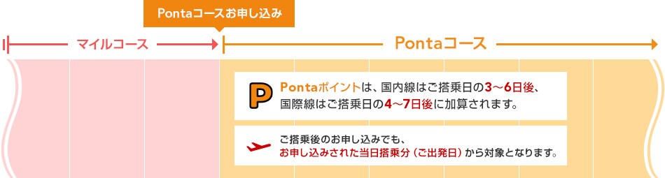 Pontaコースを選択すると、JALグループ便でご搭乗した際、フライトマイルのかわりに、フライトマイルの半数のPontaポイントを加算します。