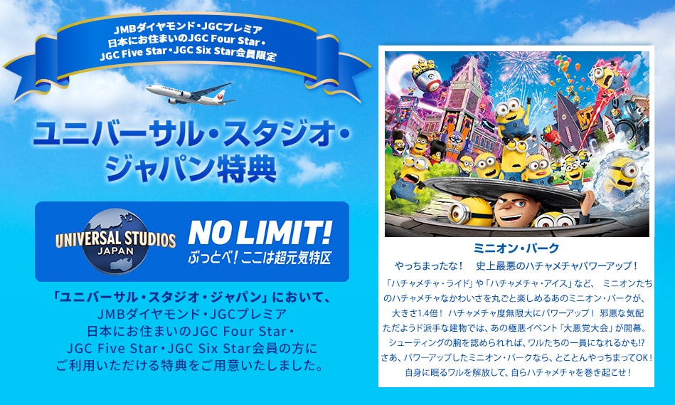 - JMBダイヤモンド・JGCプレミア・日本にお住まいのJGC Four Star・JGC Five Star・JGC Six Star会員限定 ユニバーサル・スタジオ・ジャパン特典