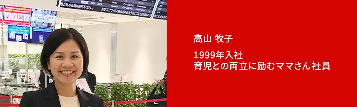 入社して約20年の間に3年間の産前産後休暇・育児休暇を取得しました。この仕事は出会うお客様や天候などにより日々状況は変わります。時には困難なこともありますが、自分一人の力だけではなく、職場の仲間や他部署の方々と協力し合い、一便一便を安全に、お客さまに安心して出発していただけるようにハンドリングしています。このように仲間と一緒に目標を目指す環境で仕事ができることに、今もなお、変わらずやりがいを感じています。一児の母となり仕事に復帰してからは、自分自身の体調管理は勿論のこと、子供の体調にも気をつけている日々です。今はまだ帰宅してから子供の世話に追われて、一日が24時間では足りないほどに忙しい毎日ですが、笑顔を忘れないことを心掛けています。