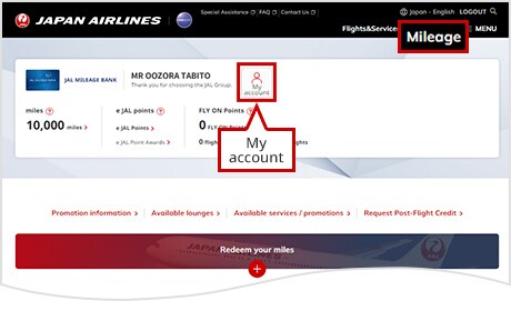 After logging in as a JMB Member, select "My account" on the Mileage top page.