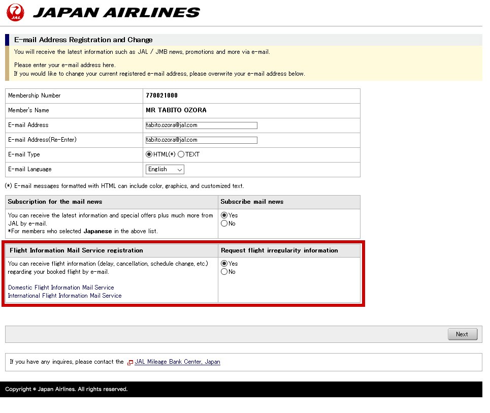 Select "Yes" under "Request flight irregularity information" to receive e-mail notification about flight information.