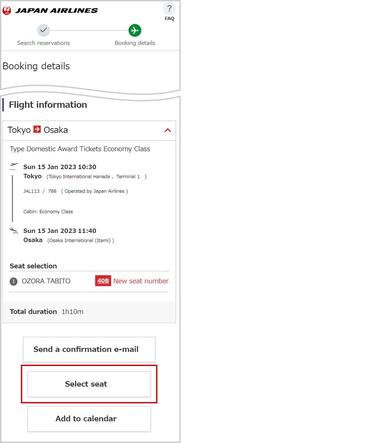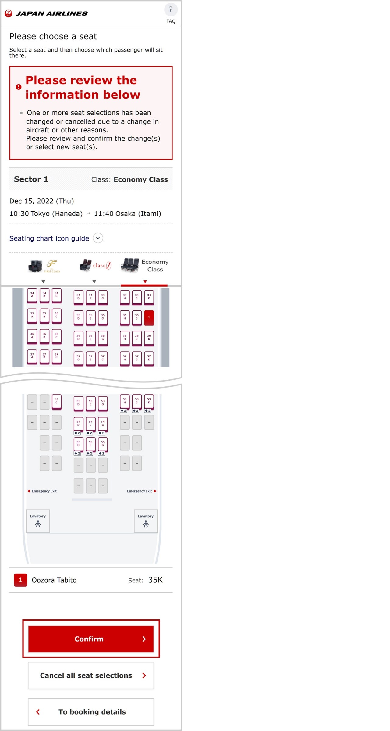 Your seat selection is confirmed, and you will be returned to the Booking Details screen.