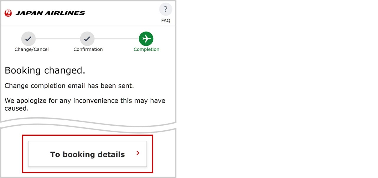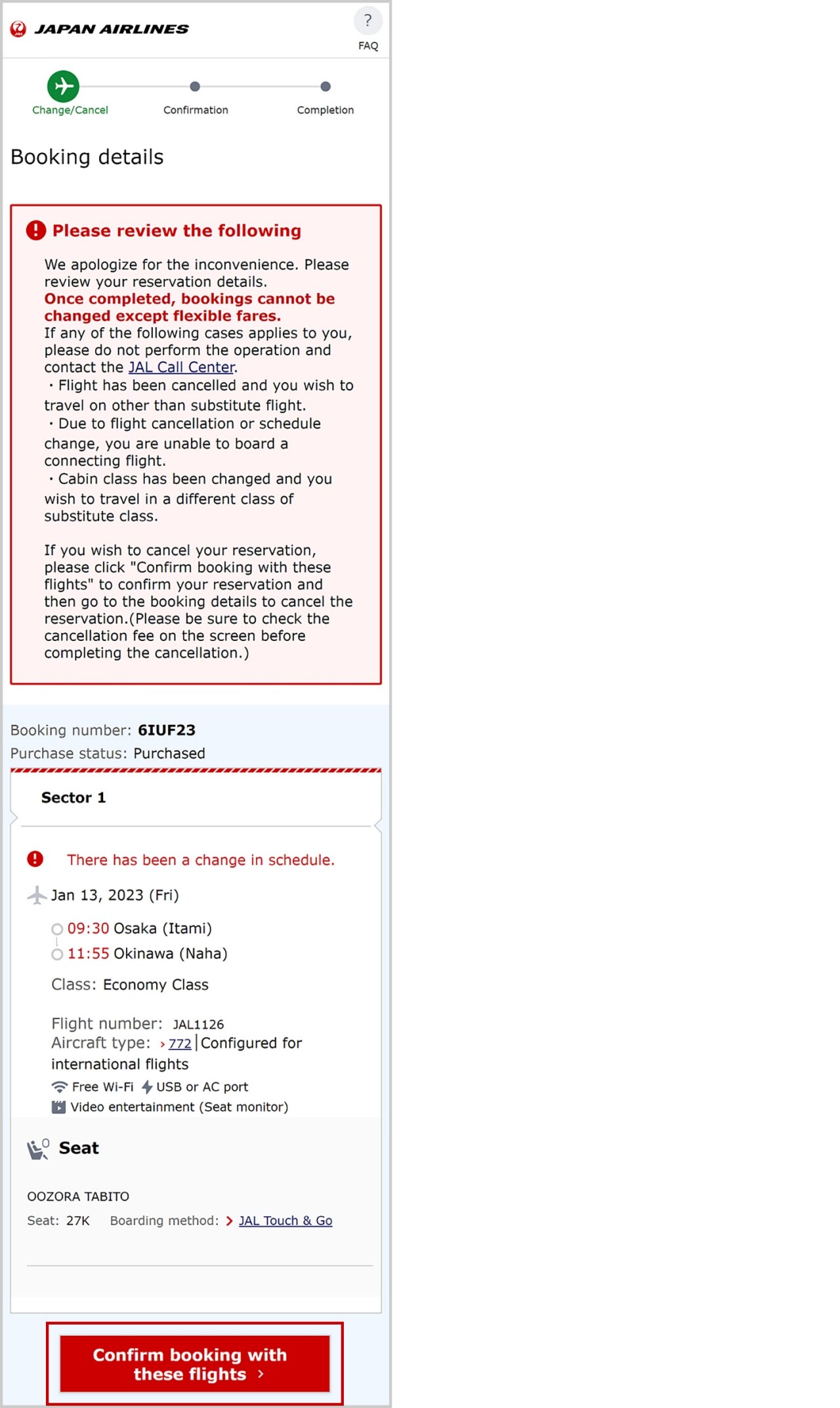 If your flight experiences a departure or arrival time change, please check the JAL website to view the new departure/arrival time and confirm your booking.