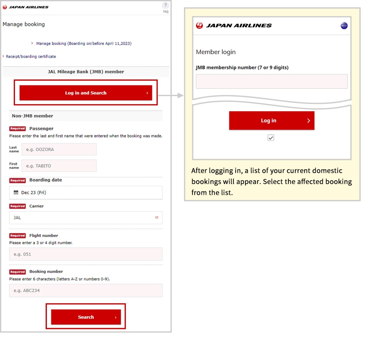 On the Manage booking screen, log in as a JMB member or enter your booking information (passenger, departure date, booking number, etc.) to search for your booking.