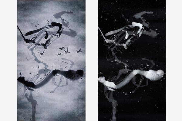 Title: Kusho – Writings in the Air: Reversible Rotation in Black and White with Cranes – New Chitose, White Light, Day and Night