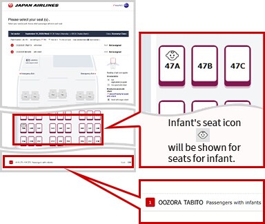 Passengers traveling with children between 8 days and 2 years old who select their seats on the JAL website will have a child icon displayed on their seats on the seat selection screen. This lets other passengers know a child may be sitting there.
