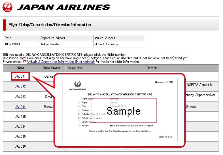 Flight Delay / Cancellation / Diversion certificates can be issued on the JAL website.