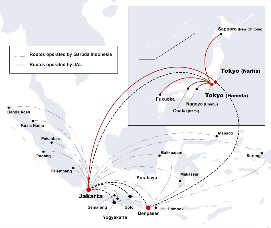 We currently operate direct flights between Haneda, Narita and Jakarta, Denpasar.