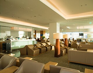 JAL First Class Lounge; high quality space with profound feeling. It offers full service for business, such as shower rooms, medical massage chairs, free Wi-Fi, etc.