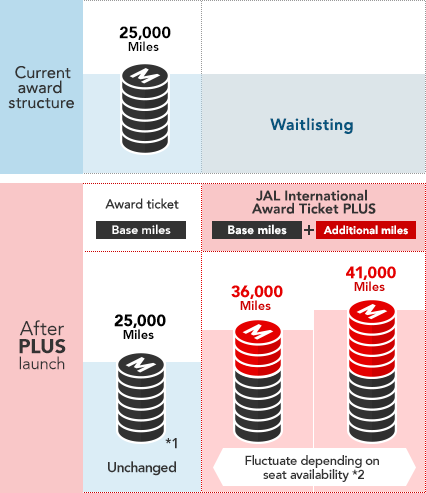 | Required mileage | Based on area and class of service | Based on route and class. JAL International Award Ticket PLUS will be introduced for Economy Class, Premium Economy Class and Business Class. *4 |
