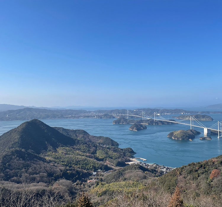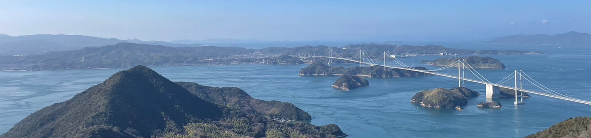 The base of Ishizuchi Shrine. The majestic main hall and well-maintained forest, like a garden, stand on a hill overlooking the Seto Inland Sea and the Shimanami Kaido. It is close to National Route 11 and JR Ishizuchiyama Station, and on the precinct, there are equipped with various facilities such as a parking lot, a shrine office, and the Ishizuchi Shrine Community Center, where you can stay and hold meetings.
