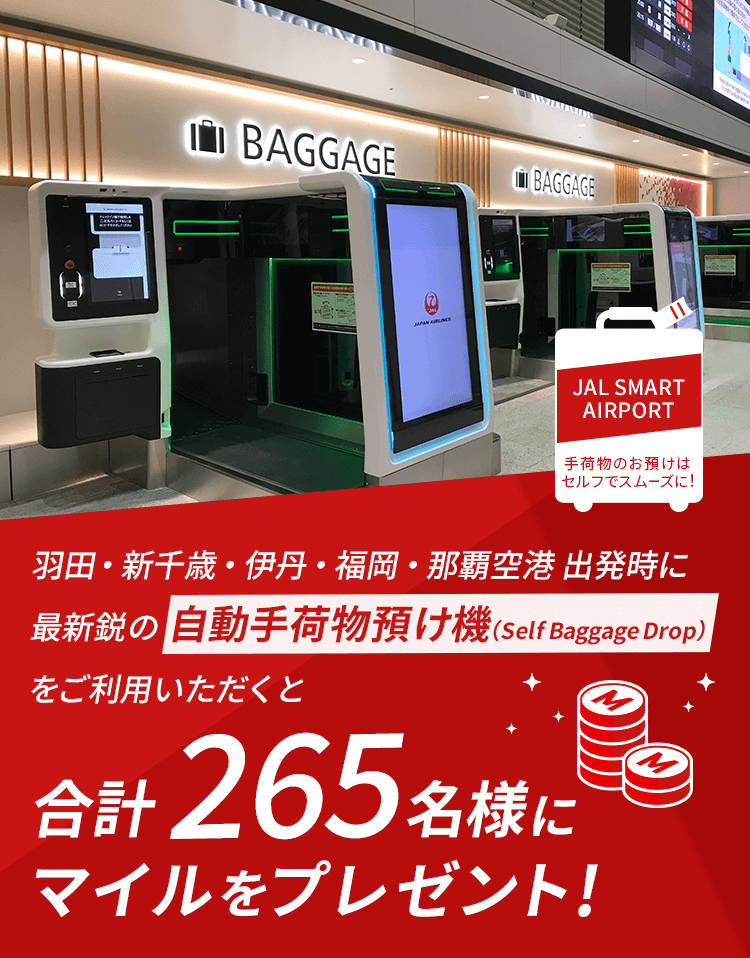 キャンペーン期間中に当ページからキャンペーン参加登録の上、自動手荷物預け機(Self Baggage Drop)を使って、手荷物をお預けいただいた、JALマイレージバンク(JMB)日本地区会員のお客さまの中から、抽選で265名様にマイルをプレゼントいたします。