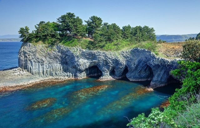 玄武岩が造り出す自然の美しい洞窟。春は遊覧船で青い海や崖の景色を存分に堪能でき、気候も快適です。
