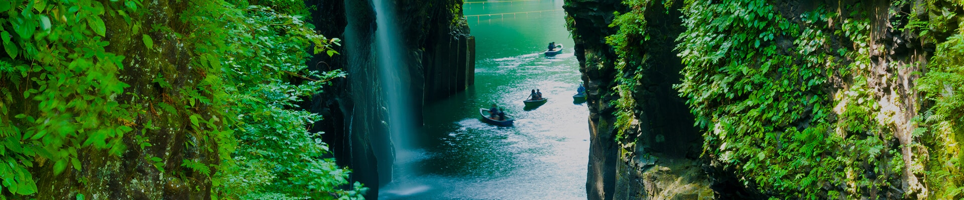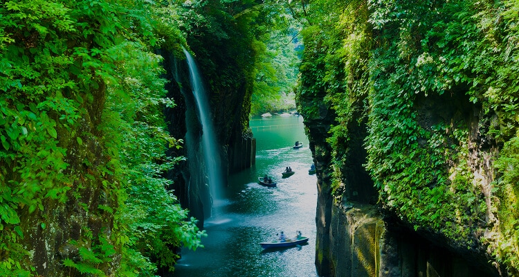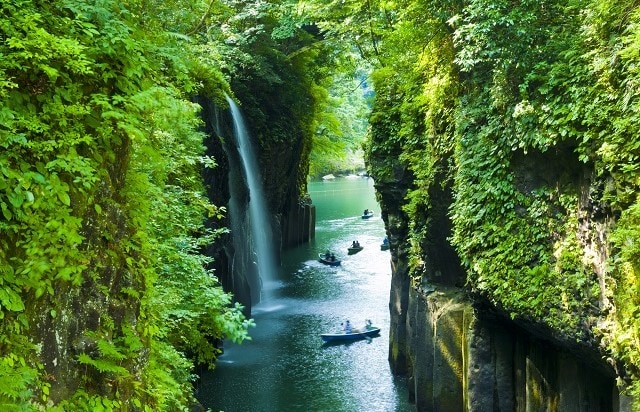 新緑の季節は特に美しく、雄大な渓谷と真名井の滝が作り出す景観は圧巻。ボートでの川沿いの散策が爽快です。