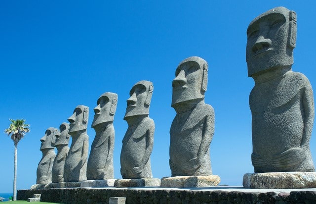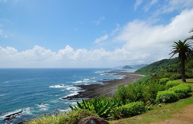 小高い丘の上に位置する「サンメッセ日南」には、世界で唯一イースター島から許可を受けて完全復刻された7体のモアイ像が並ぶ。