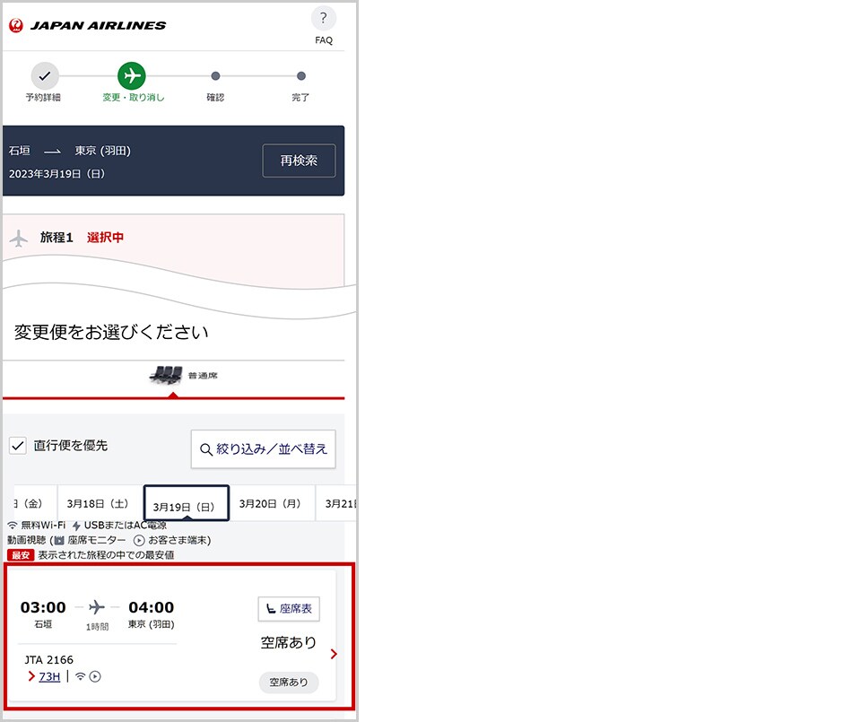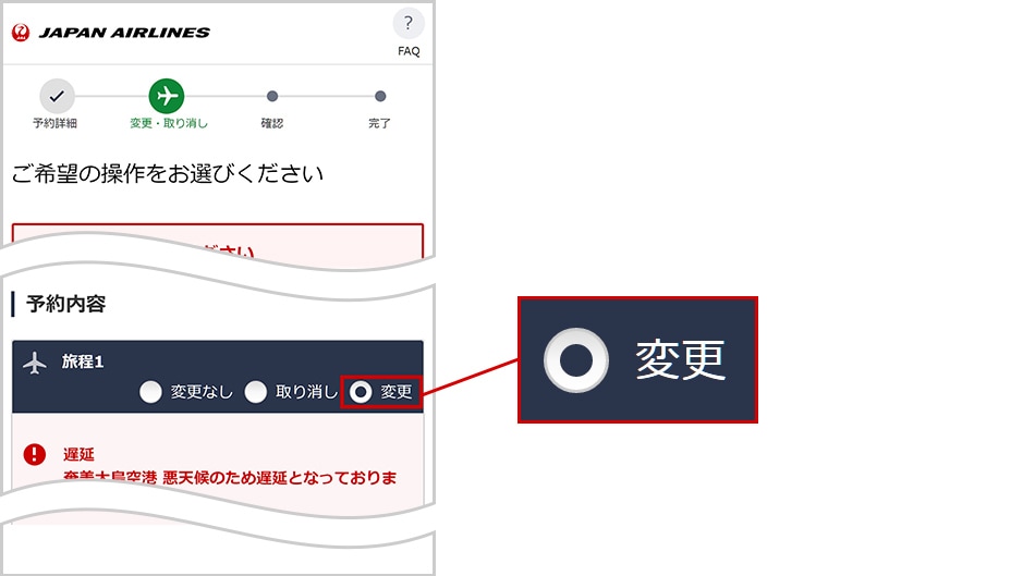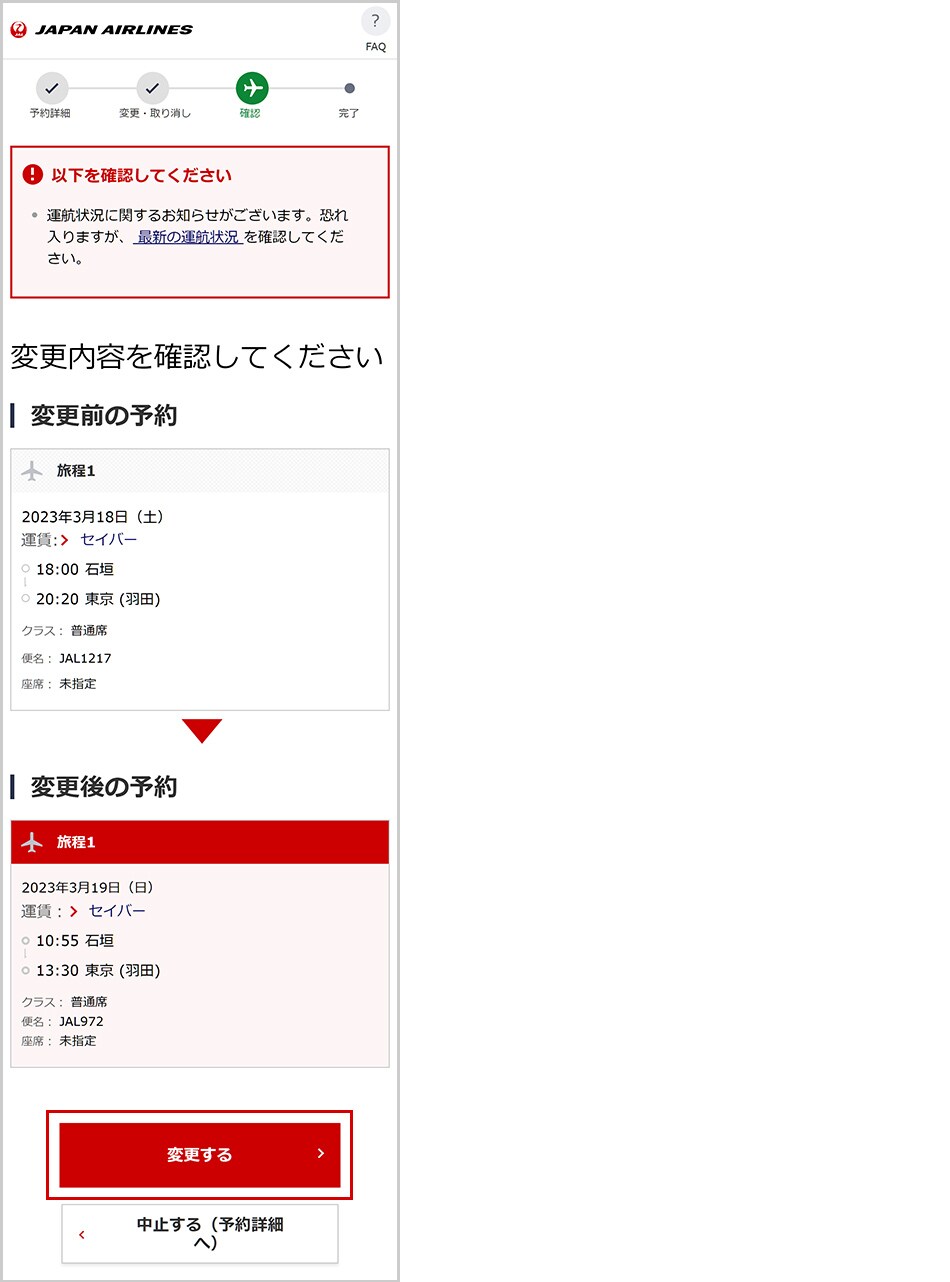 ご予約状況をご案内しています。悪天候・自然災害・機材故障などで遅延・欠航が見込まれる便、および遅延・欠航が決まっている場合には、この画面に表示されます。変更をご希望の場合は、「予約内容を変更・取り消しする」ボタンをクリックまたはタップしてお進みください。