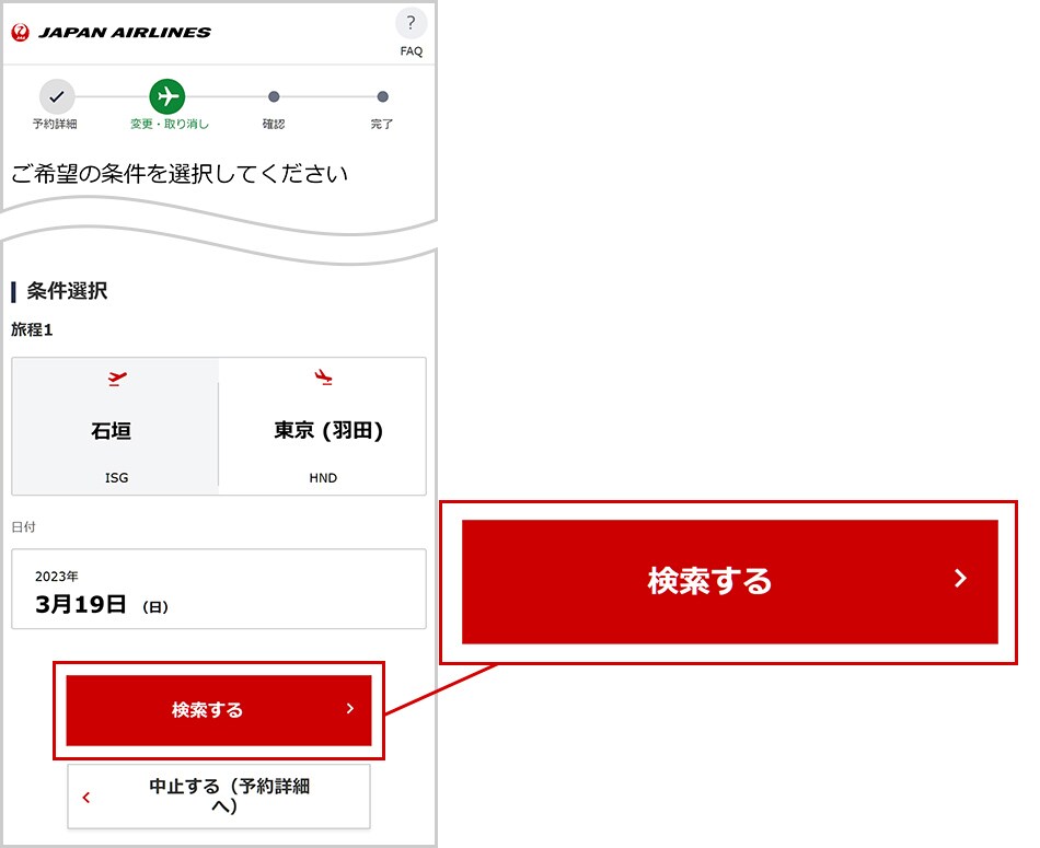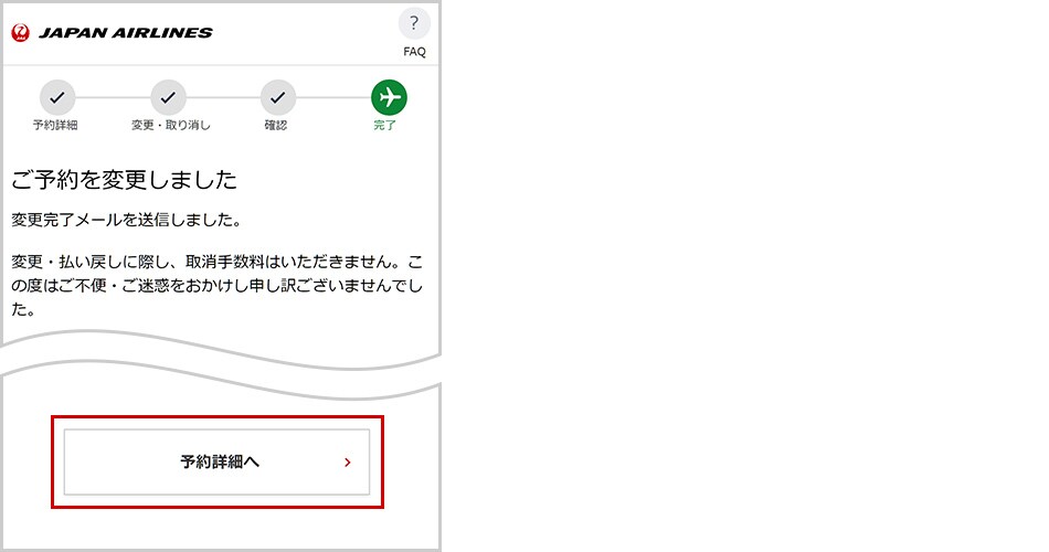 変更手続きは終了です。 ご搭乗日当日、直接空港にお越しください。(搭乗方法に記載されている方法でご搭乗ください) 「予約詳細」をクリックまたはタップしてもう一度予約詳細を表示すると、搭乗方法をご確認いただけます。
