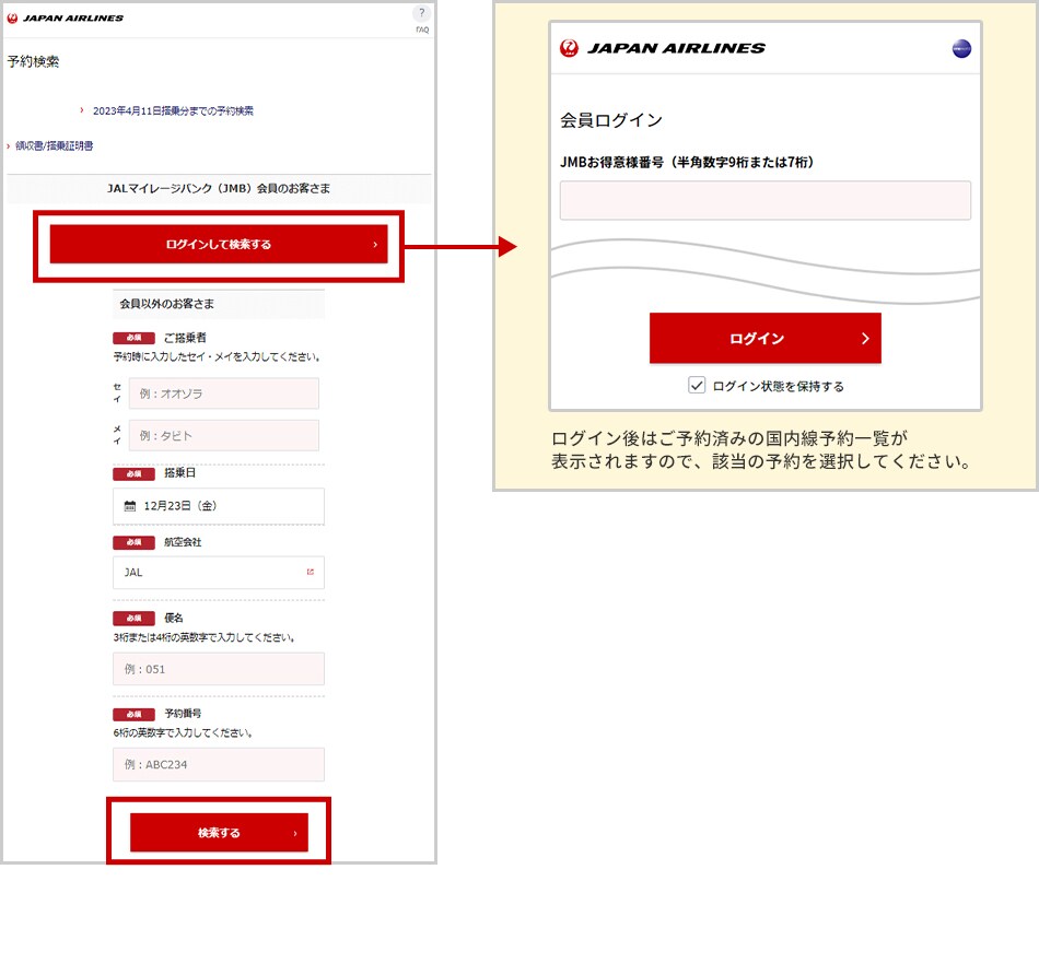 予約検索画面で会員ログインまたはご予約情報(搭乗者、搭乗日、予約番号など)を入力し予約内容を検索します。