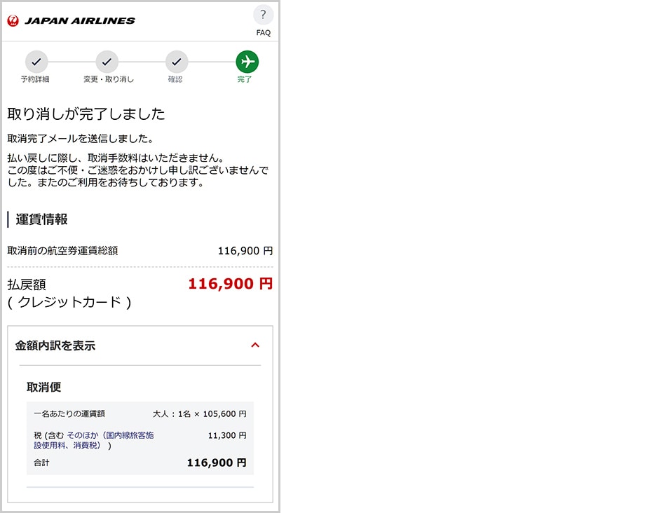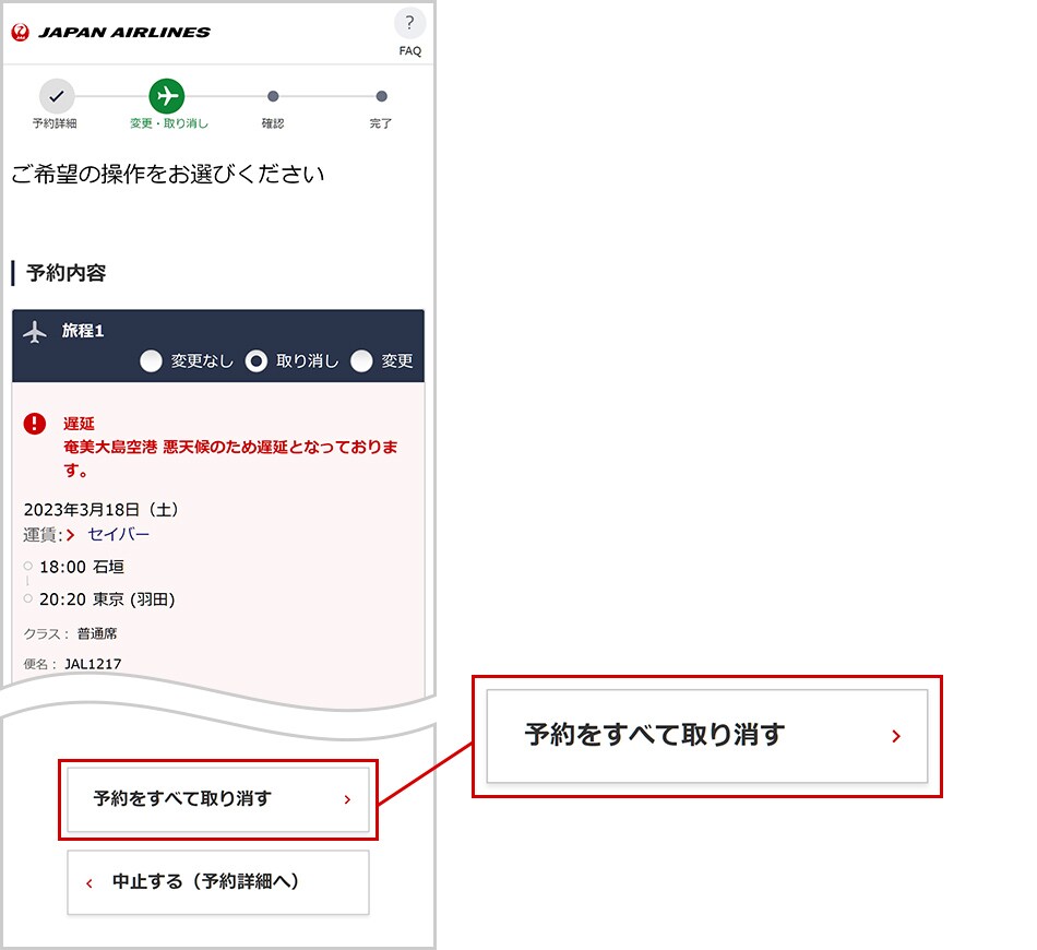 全旅程の取り消しをご希望の場合は「予約をすべて取り消す」ボタンから払い戻し操作を行ってください。 一部旅程の取り消しをご希望の場合は取り消したい便の「取り消し」ボタンを選択し、「次へ」をクリックまたはタップしてください。(手数料はかかりません)