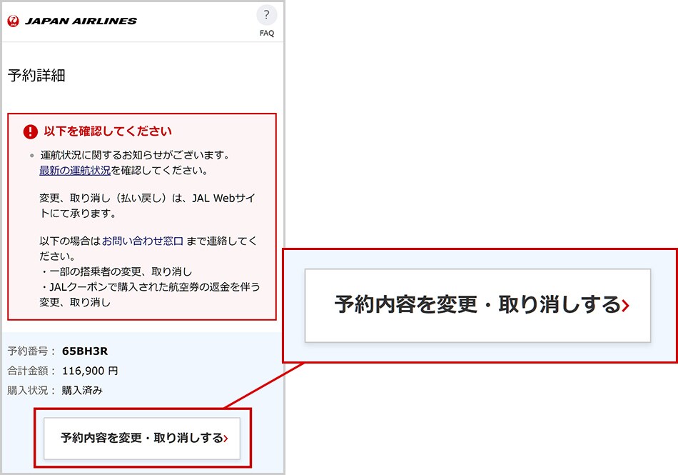 ご予約状況をご案内しています。悪天候・自然災害・機材故障などで遅延・欠航が見込まれる便、および遅延・欠航が決まっている場合には、この画面に表示されます。払い戻しをご希望の場合は、「予約内容を変更・取り消しする」ボタンをクリックまたはタップしてお進みください。