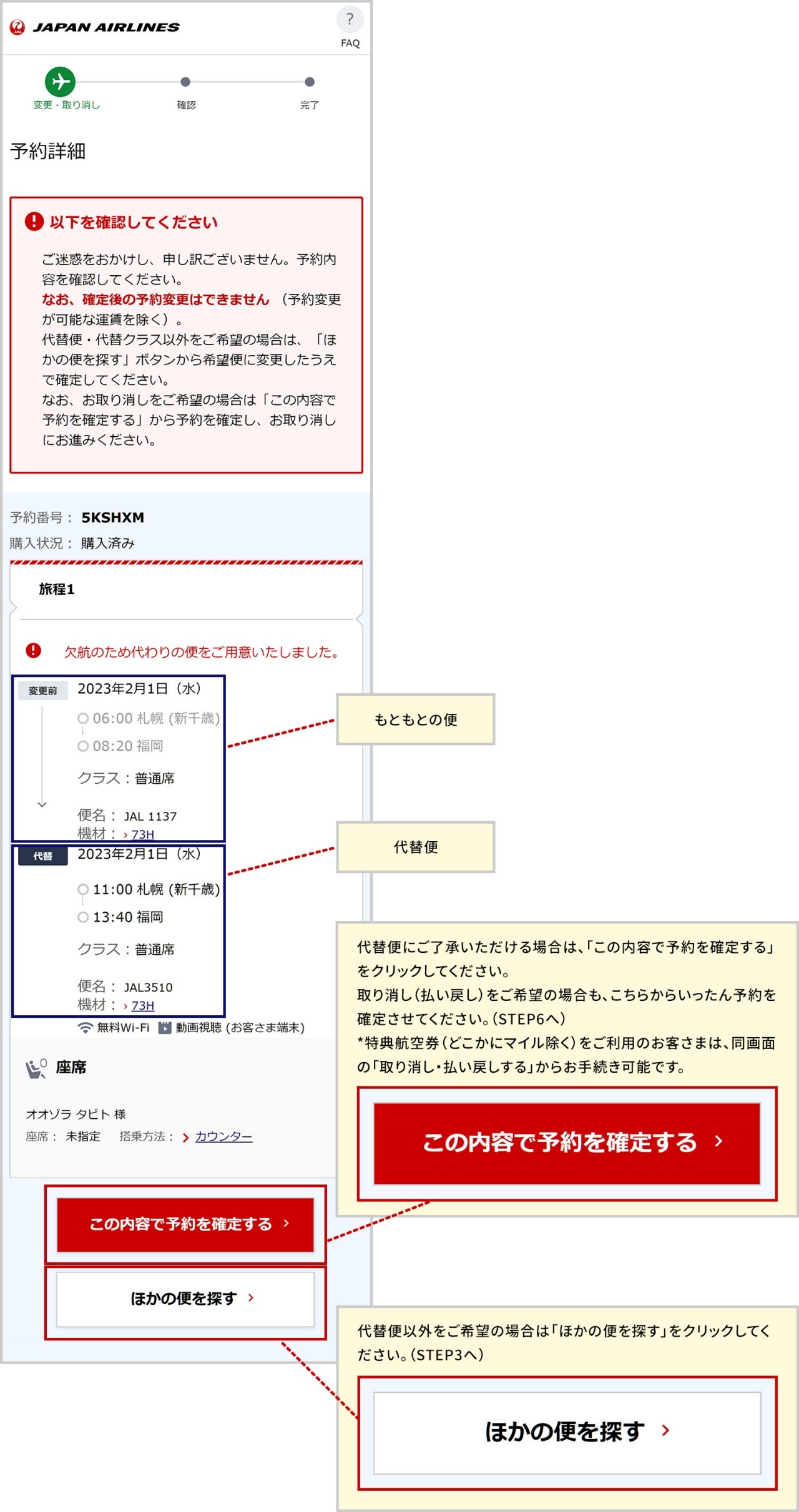 ご予約状況をご案内しています。(代替便がある場合は合わせてこの画面に表示されます。)