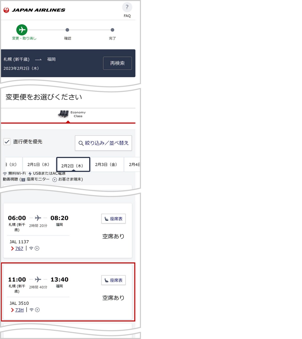 運休・減便になった場合は、JAL Webサイトにて新しい予約内容をご確認の上、予約便の20分前までにお手続きください。