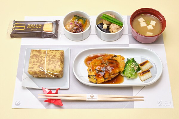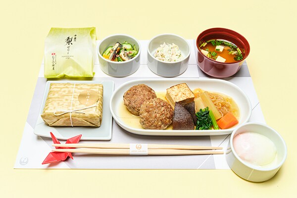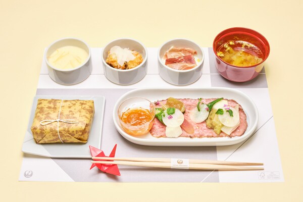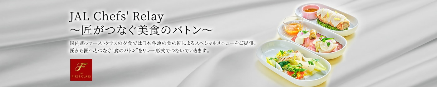 国内線ファーストクラスの夕食では日本各地の食の匠によるスペシャルメニューをご提供。匠から匠へとつなぐ“食のバトン”をリレー形式でつないでいきます。