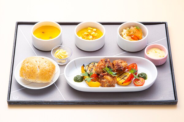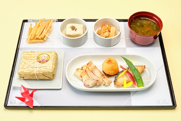 空の旅で能登、石川の景色、食の豊かさを感じ楽しんでいただけるようにとご提案いたしました。石川には海があり山があり田畑、そして川があります。郷土料理を川嶋流にアレンジし心温まるお料理で素敵な空の旅になっていただけますと幸いです。