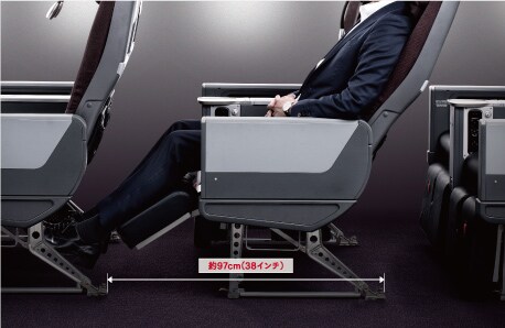 普通席より約18cmも広い、前後約97cmのシートピッチ。ストレスなくゆとりある空間でおくつろぎください。