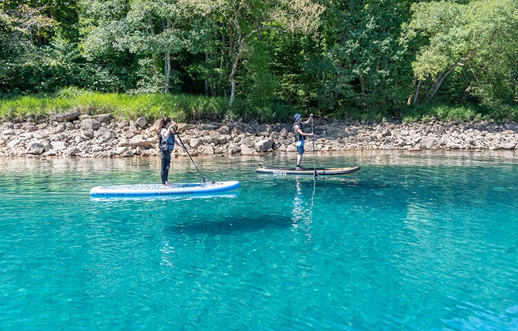 水深日本一。透き通った湖面でカヤックやSUPなども楽しめます。