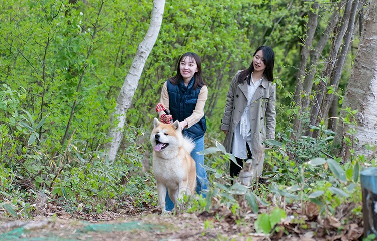 秋田犬は県産の日本犬。三種町では一緒に散歩できる体験があります。