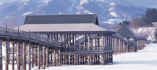 全長300mを越える日本一長い木造の三連太鼓橋。津軽富士見湖に映る姿は繊細でとても美しい。遠くに岩木山を望むことが出来ます。