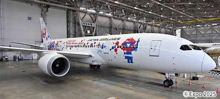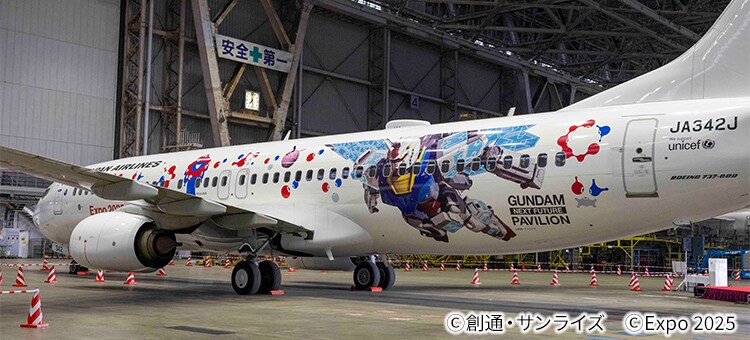 大阪・関西万博でバンダイナムコが出展する「GUNDAM NEXT FUTURE PAVILION」内の映像に登場する「RX-78F00/E ガンダム(EX-001 グラスフェザー装備)」と、大阪・関西万博公式キャラクター「ミャクミャク」が塗装されたオリジナル特別塗装機を運航中!