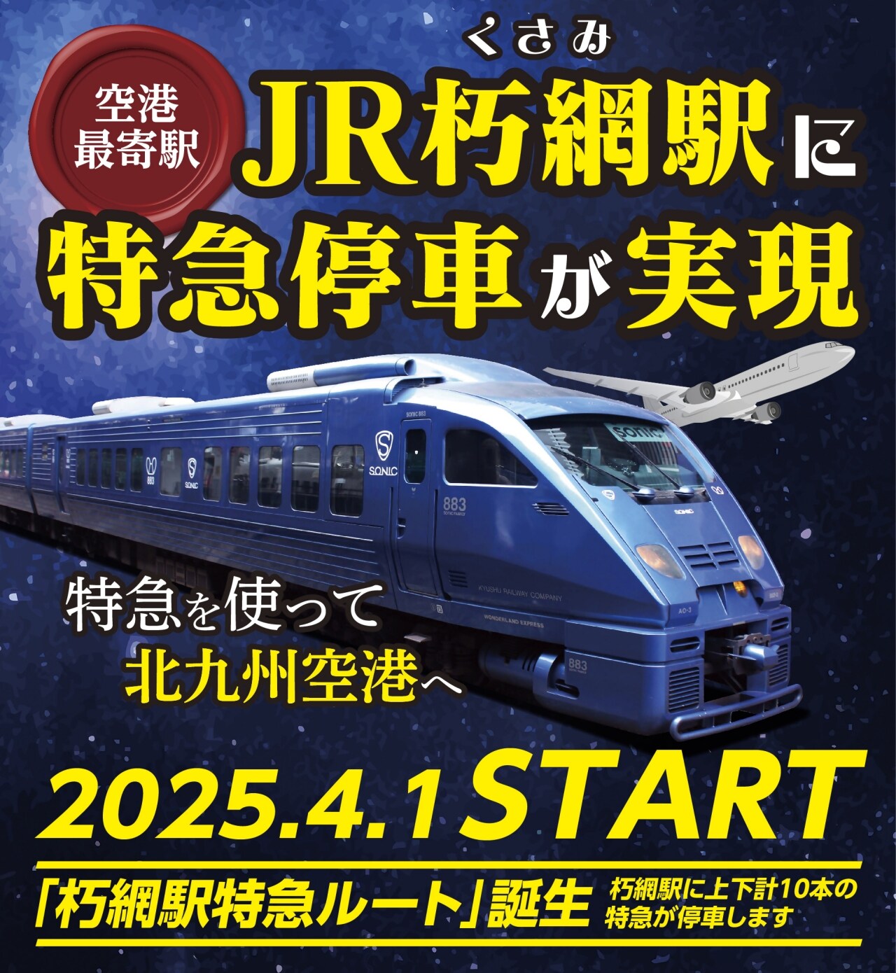 2025年4月1日から北九州空港最寄り駅である朽網(くさみ)駅に特急ルートが誕生いたします。特急が停車することでビジネスも観光も北九州空港がますます便利に!