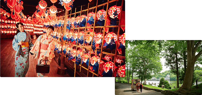 馬車での公園巡りはご家族連れにもおすすめ。季節に合わせた灯篭で彩られた館内でゆっくりお過ごしください。