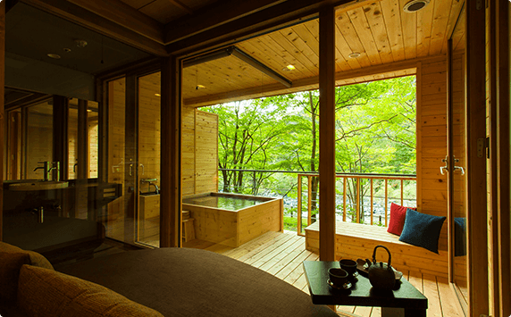 3室限定の露天風呂付き客室。渓流を望むプライベートバスで、景色を眺めながらいつでも温泉に入れます。