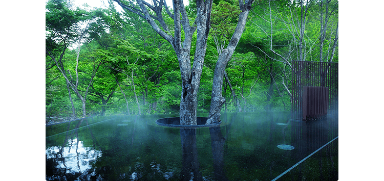 開放的な空間でとろりとした肌触りの温泉を楽しめる露天風呂。冬にはねぶたと灯篭が浮かびます。