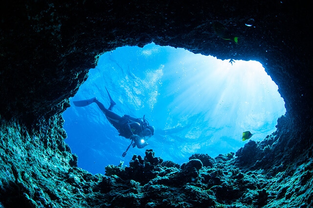 恩納村・真栄田岬に位置し洞窟内に差し込む太陽の光が反射し神秘的な青色に輝く人気の絶景スポットです。