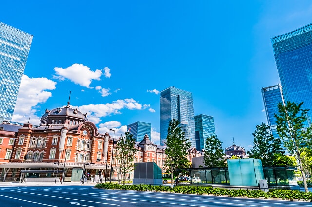 東京・丸の内のシンボル、東京駅。煉瓦造りのレトロな駅舎と周辺のオフィスビルとのコントラストが特徴的。