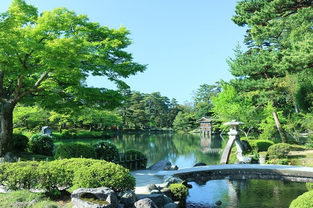 日本三名園のひとつと称される兼六園。雨に濡れた庭園はしっとりとした美しさがあり、普段とは違った趣が楽しめます。