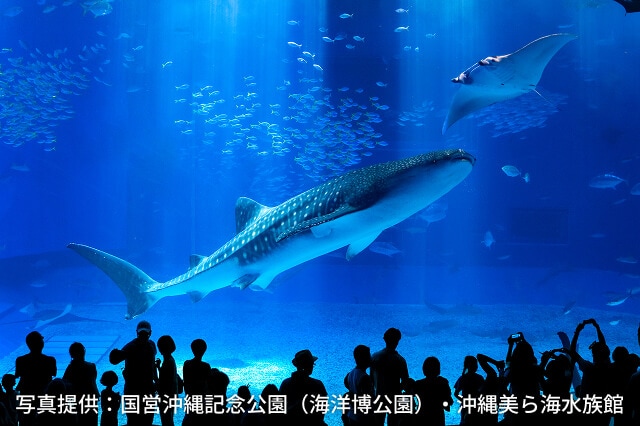 世界最大級の水槽にはジンベエザメやマンタが泳ぎ、子どもから大人まで楽しめる人気スポットです。