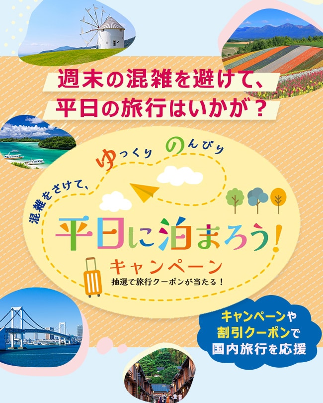 お一人様あたり10,000円以上の平日宿泊のJALダイナミックパッケージ(国内)をご予約し、実際にご旅行されたお客さまが対象となります。