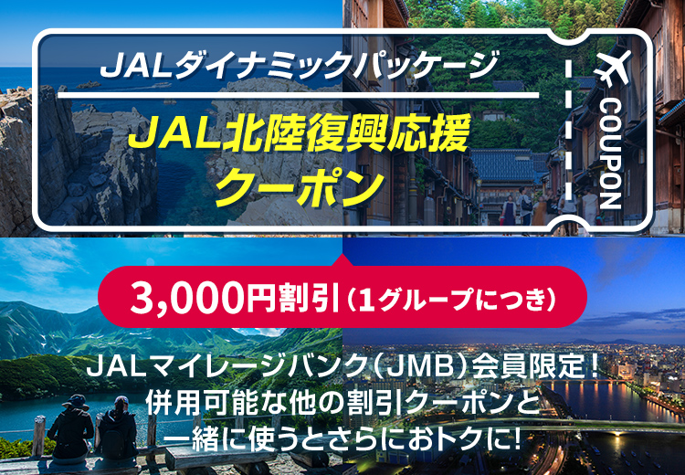 JALダイナミックパッケージ JAL北陸復興応援クーポン 3,000円割引(1グループにつき) JALマイレージバンク(JMB)会員限定! 併用可能な他の割引クーポンと一緒に使うとさらにおトクに! JALダイナミックパッケージ JAL北陸復興応援クーポン 3,000円割引(1グループにつき) JALマイレージバンク(JMB)会員限定! 併用可能な他の割引クーポンと一緒に使うとさらにおトクに!